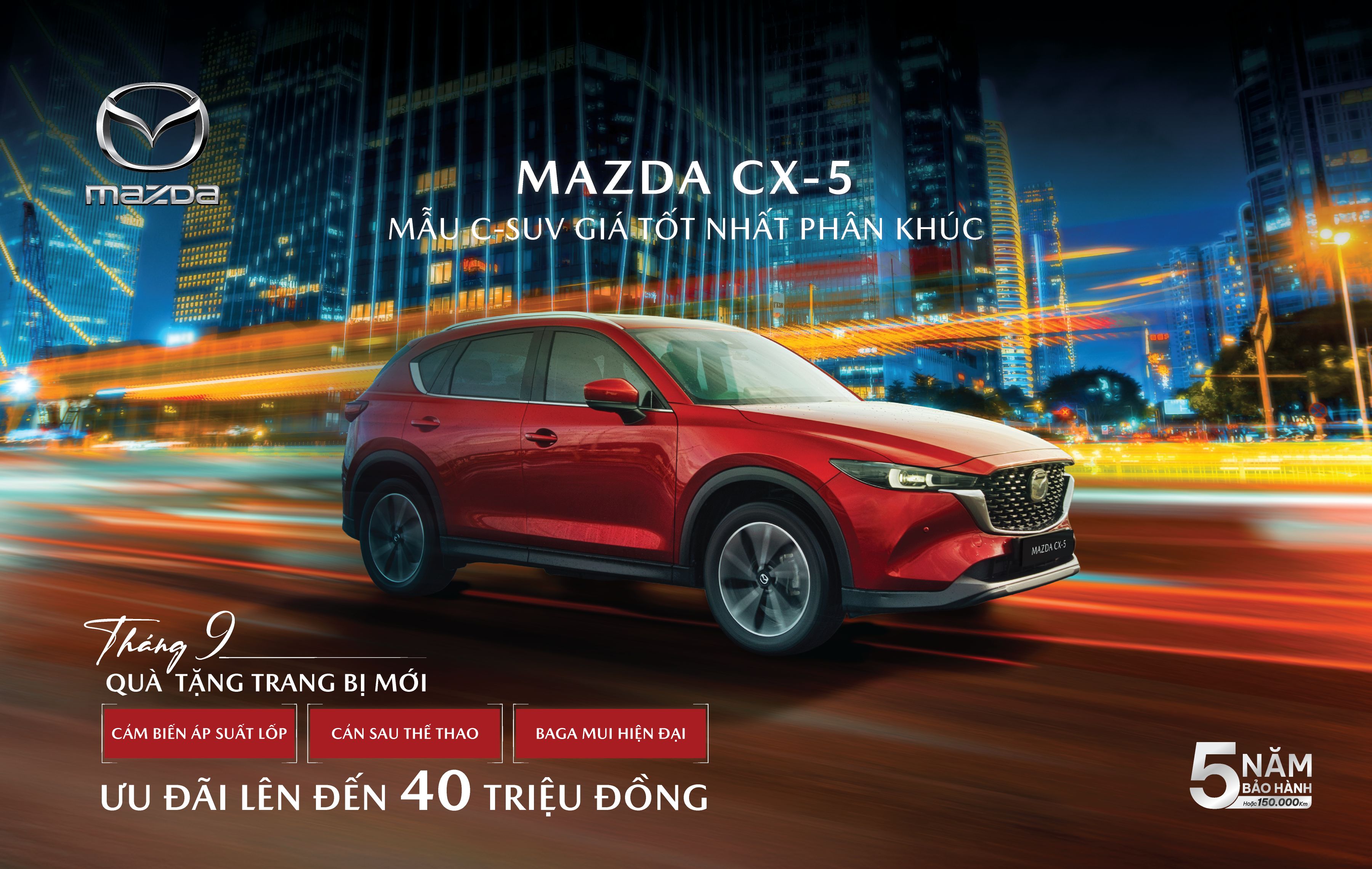 Tháng 9/2025, Mazda CX-5 tăng trang bị và ưu đãi lên đến 40 triệu đồng, giá bán sau ưu đãi từ 709 triệu đồng – mức giá tốt nhất phân khúc C-SUV hiện nay.